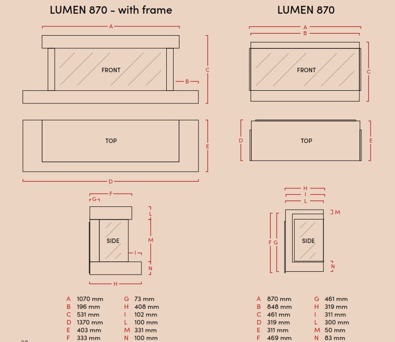 Предлагат се в три естетически конфигурации – фронтална, ъглова или панорамна – предлагайки максимална свобода на дизайна и подчертавайки пламъка от една или няколко перспективи, в зависимост от пространството и стила на помещението.